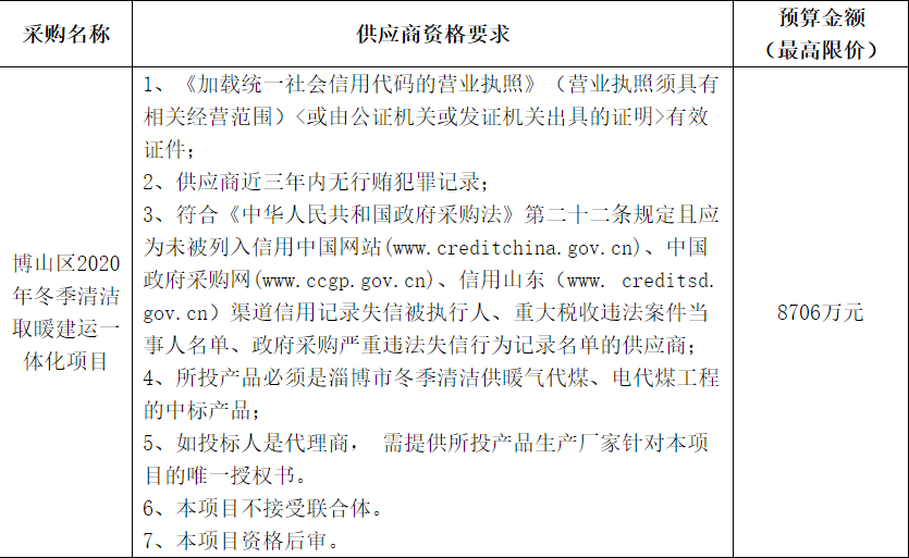 1.时间:2020年07月09日08时30分至2020年07月15日17时00分(北京时间,法定节假日除外) 2.地点:网上报名下载。已报名投标单位请于2020年07月15日17:00前登录淄博市公共资源交易网下载本项目的电子采购文件,逾期将无法下载。逾期未下载电子采购文件视为放弃报名,如参与投标报价,将被拒绝。备注:请各供应商获取电子采购文件后随时关注交易平台答疑文件下载栏目。①为满足信息公开和供应商诚信体系建设需要,供应商需在山东省政府采购信息公开平台进行注册。已经注册的供应商只需登录淄博市公共资源交易网进行报名;未注册的供应商必须同时登录山东省政府采购信息公开平台(http://www.ccgp-shandong.gov.cn)点击“供应商”进行注册,然后通过淄博市公共资源交易网报名。②已经完成淄博市公共资源交易网注册的供应商可直接登录淄博市公共资源交易网(http://ggzyjy.zibo.gov.cn/)针对本项目点击报名。未在淄博市公共资源交易网注册的企业,登录网站后点击“企业会员系统”,免费注册(注册类型:供应商),填写企业相关信息并上传有关资料的原件扫描件提交验证,平台即时通过后进行网上报名。咨询电话:0533-7015033/7015034,咨询时间:北京时间8:30~11:30;13:30~17:00(法定公休日、法定节假日除外)。技术咨询电话:400-998-0000。公告期限:2020年07月09日至2020年07月15日1.时间:2020年07月30日09时00分前(北京时间)通过淄博市公共资源交易网“上传投标文件”栏目上传加密的电子投标文件。2.地点:本项目实行网上开标,各供应商无需至开标现场进行开标。3.本项目实行网上招投标,投标单位递交投标文件时应注意以下事项:3.1 拟参加本项目的供应商须办理并取得数字证书(电子印章)后,方可加密生成及上传电子投标文件。请各供应商仔细阅读《企业数字证书(电子印章)办理须知》(淄博公共资源交易网→办事指南→下载园地)并按照须知要求办理。3.2 供应商可到淄博市公共资源交易中心一楼大厅办理数字证书,也可网上办理。数字证书办理电话:0531-8880-7619。3.3 加密的电子投标文件通过淄博市公共资源交易网“上传投标文件”栏目在电子投标文件截止时间前上传。3.5 其他具体操作请参考“新点投标文件制作软件(淄博版)操作视频-采购类”(淄博市公共资源交易中心网站→办事指南→下载园地),技术咨询电话:400-998-0000。3.6本项目实行网上开标模式,各供应商无需至开标现场进行开标。3.7请各供应商在开标前根据“淄博网上开标大厅操作手册(投标人)”提前调试电脑。3.8请各供应商在开标前登陆淄博市公共资源交易网(http://ggzyjy.zibo.gov.cn/TPFront/)并进行投标文件解密、答疑、澄清等。各供应商必须时时在线,直至评标结束。1.时间:2020年07月30日09时00分(北京时间)①开标截止时间后,请各供应商根据网上开标流程进行操作并对投标文件进行解密。供应商应当在解密开始时间后10分钟内完成解密工作(以网上开标系统解密倒计时为准),每次解密时长最多延长2次,每次10分钟。具体操作请参考并仔细阅读“淄博网上开标大厅操作手册(投标人)”(淄博市公共资源交易网→办事指南→服务指南),技术咨询电话:400-998-0000。②请各供应商务必再次确认所上传的加密电子投标文件,是否能正常参与开评标活动,若由此造成的一切后果均由各供应商承担。联系方式: 0533-3587330、18560823099十、监督机构:博山区清洁取暖建设工作领导小组,联系电话:0533-4171719十一、采购项目的用途、数量、简要技术要求等:详见招标文件十二、采购项目需要落实的政府采购政策:详见招标文件十三、发布媒体:淄博市公共资源交易网、中国招标投标公共服务平台、中国采购与招标网