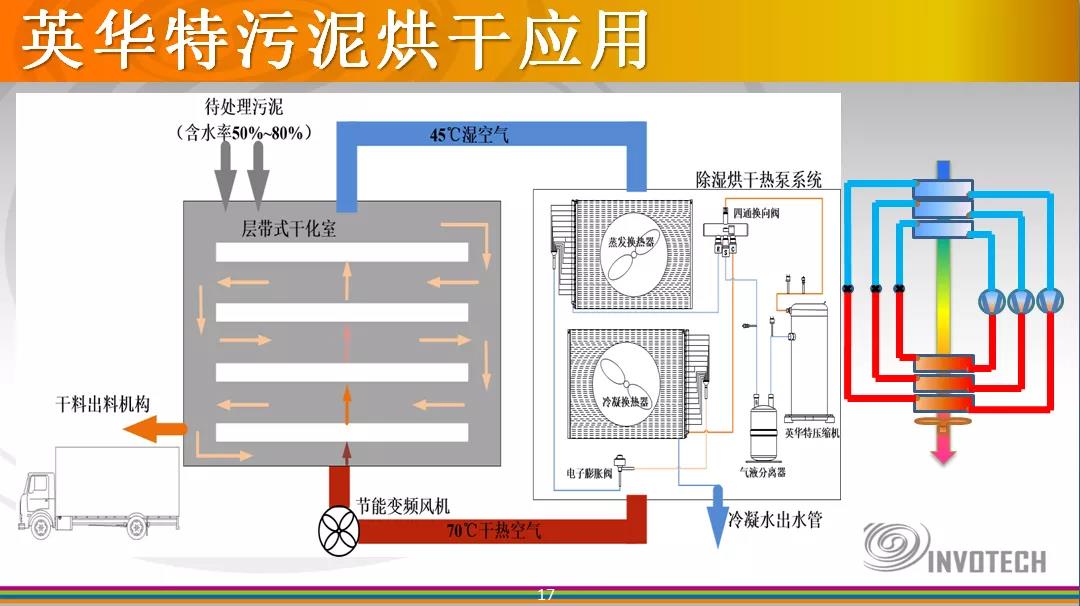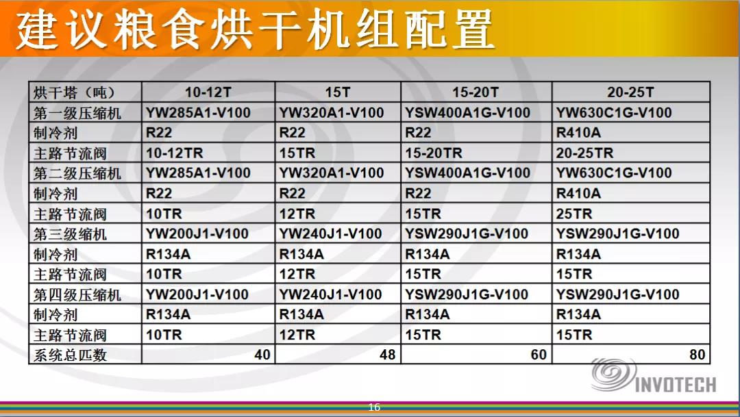 第3个案例。现场是在苏州相城区粮站,一共是20套机组。接下来看三个现场的具体的参数。案例一:压缩机选型是4台H355A1-100和两台YW320A1-100,20吨每天。还有一种选型是8台YW185A1-100,产量15吨每天。出风,温度高达60~65。使用成本,客户那边提供的信息是将一个水分点约为0.002元每公斤,比常规的烘干机节能70%~80%。案例二:选用的是4台YW285A1-V100,出风温度60~65。案例三:相城城区的现场,使用的是两台YW285A1-V100加两台YW200J1-V100,是比较推荐的一个配置。因为粮食烘干它的冷凝器侧是逐级加热,根据加热的原理来匹配压缩机,这样的话可以达到能效更高。这边是用20套机组带10个30吨的烘干塔。这个项目的特点就是烘干的整体设计方案,从粮食的进入到烘干,然后最后进入粮库都是自动化一体的;整体的除尘方案,粮食进入烘干塔之前要先做一个除尘,除尘完了以后进入烘干,塔内部排出来的灰尘也会经过集中处理。这个系统使用了补气增焓的压缩机,它像热泵采暖、空调一样,加上了一个中间的板块,叫真正意义的补气增焓。关于粮食烘干机的配置,比如说一个10-12吨的烘干塔,第1级建议使用10匹补气增焓压缩机,第2级的话建议使用补气增焓的压缩机,冷媒是R22。第3级和第4级,建议使用的是10匹R134A补气增焓的压缩机,这样的话它在逐级加热的时候效果会比较好。粮食烘干机现在其实还有一些需要优化的地方,比如说除霜,除尘,还有余热回收等细节问题。现在也有很多企业及机构在努力优化。3.2 污泥烘干接下来看污泥烘干的应用案例。污泥烘干的系统图就是右边这样,蒸发器是串联,冷凝器也是串联。有一些厂家为了让除湿效果更好,让蒸发器回风和蒸发器出风做一个余热回收,这样的话就可以达到更好的除湿效果。污泥烘干的案例一,出风温度是70℃,回风温度约50℃,可以达到每个小时出水150公斤到200公斤之间,使用的环境温度是负10℃到40℃。现场是在山东。污泥烘干案例二是广东南沙区某电镀厂的一个烘干案例,要求把污泥处理到含水量到25%,每日的污泥处理量是16吨。污泥烘干三,这是另外的一个案例,这个是它的出水量的一个名牌。 3.3 烟草烘干接下来看一下烟草烘干,烟草烘干其实在国内大部分人使用的系统有这两种系统。第一种直排式的。还有一种就是在云南,现在很多人在做这种开闭式结合一体的,当然了每一种系统都有自己的优点或者缺点。先看一下案例一,这个是河南的一个烟草烘干项目,环境温度是0~35℃,蒸发温度是0~20℃,冷凝温度高达85℃。案例二是普洱市云仙乡烟草烘干项目。这个是一个改造项目,使用的是烘干专用压缩机,使用环境温度是5~30℃,蒸发温度是0~20℃,那冷凝温度高达85℃。3.4 农蔬烘干接下来是农蔬烘干的一些解决方案,这些烘干使用的比较多的是开式循环,开闭式循环,还有闭式循环。其实主要是根据烘干物料的工艺需求来匹配更好的一个系统。这个是杏子烘干案例,现场是在新疆,使用的是10匹R134A压缩机不带补气增焓,使用环境是18℃到31℃,出风温度是65℃,单台产量是1.5~2吨,时长约20小时。这个是红枣的烘干案例,现场是在好想你枣业。这边一共是有18台,他是一个开式循环加上部分的余热回收,出风温度是65℃,产量是6~8吨/天。当然除了杏子烘干、红枣烘干,其实还有很多烘干,没有一一列举。比如说宁夏的枸杞烘干、亳州的中药材烘干。最后,做一个总结:1、涡旋技术是理论上能源效率最高的压缩机之一;2、就是相比于其他的压缩机,涡旋压缩机,在大排量和低噪音之间取得比较好的平衡,非常适合于烘干;3、涡旋技术,能更有效地处理高压缩比的状态;